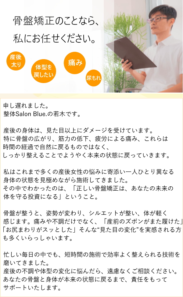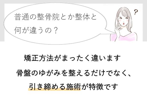 当店では、骨盤を正しい位置に整えながら、広がりや緩みを引き締めていく独自の矯正を行うため、