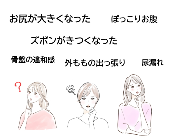 産後にお尻が大きく見える原因の一つは、出産で広がった骨盤の状態が続いているためです。